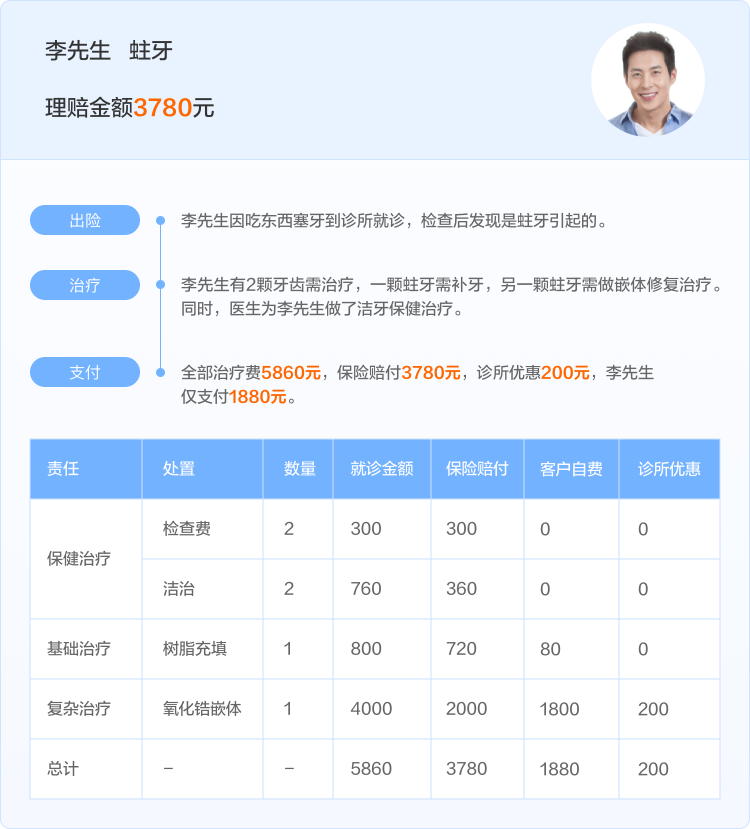 無需被保險人向保險公司辦理任何索賠手續(xù)或提供資料,這也是我們齒科醫(yī)療產(chǎn)品的理賠直付特色和優(yōu)勢