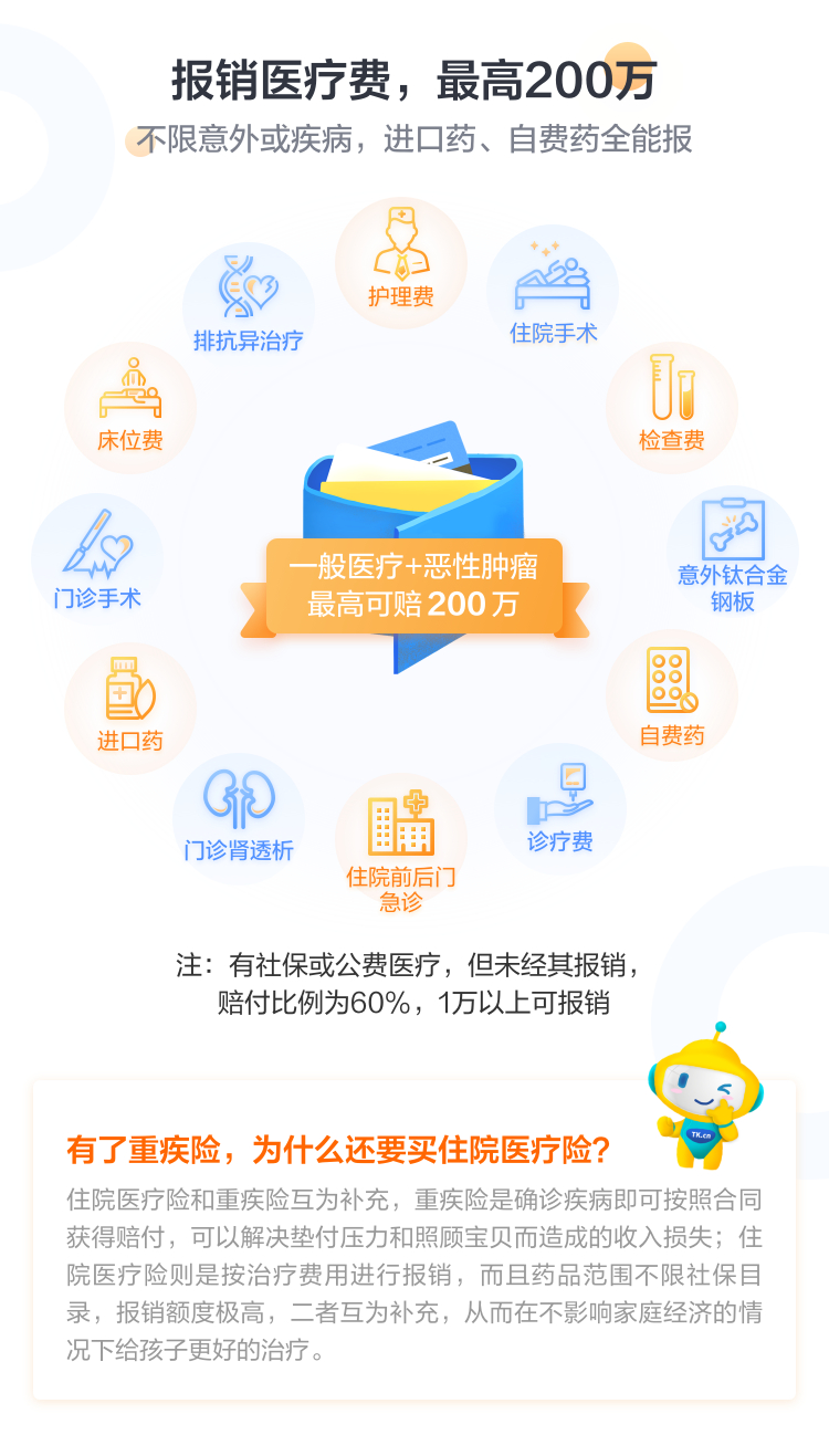 被保險人在等待期后確診罹患惡性腫瘤,住院及特定門急診費用可報銷,靶向藥等社保外費用也可報,最高200萬。