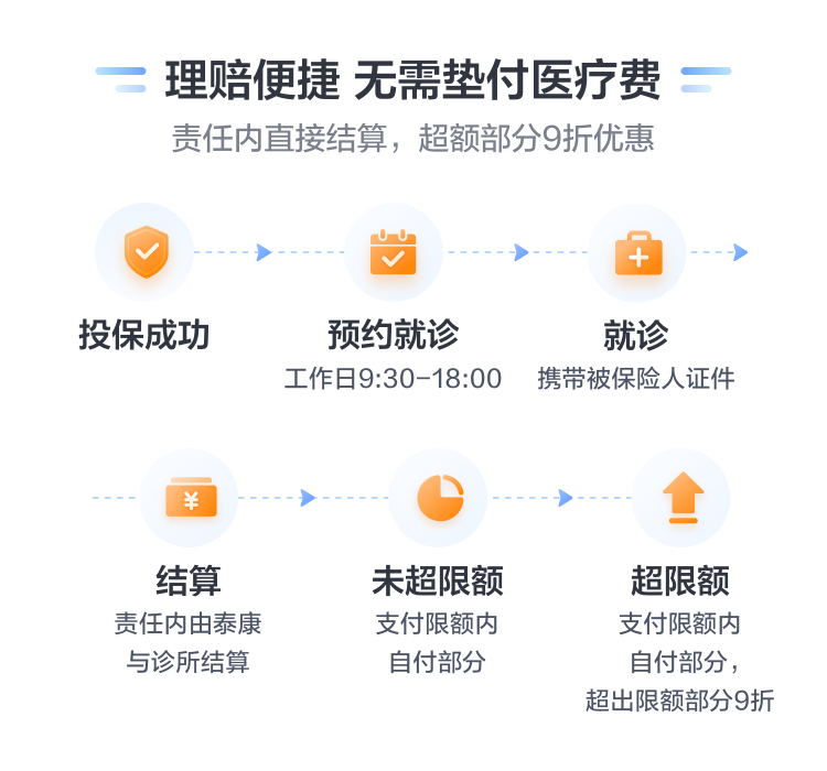 持被保險人投保時所用的有效證件就醫(yī),在保險責任范圍內(nèi)且在賠償限額內(nèi)的醫(yī)療費用(除限額內(nèi)自費部分),您不需要墊付,由口腔診所直接與我司結(jié)算。