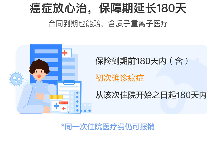 A:在本合同保險期間屆滿前180內(nèi)(含第180日)經(jīng)醫(yī)院初次確診罹患本合同約定的癌癥,并且在醫(yī)院接受住院治療,到本合同保險期間屆滿日時,被保險人尚未結(jié)束住院治療的,若沒有續(xù)保,對于被保險人因本次住院治療,自被保險人自該次住院開始日起(含住院當日)起180日內(nèi)(含第180日)支出的必需且合理的住院醫(yī)療費用,我們將按照本保險合同的約定在保險金額內(nèi)承擔向被保險人賠償保險金的責任。