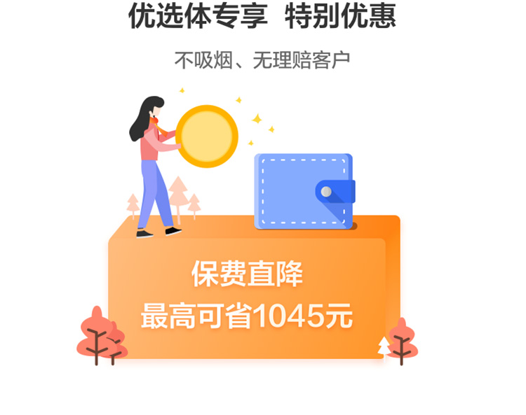 A : 本保險產(chǎn)品針對首次投保時無吸煙習慣(每日吸煙小于10支)或吸煙史(吸煙史小于10年)的被保險人提供優(yōu)選體費率。